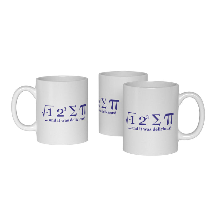 The I Ate Some Pie mug even goes one step further and uses other mathematical terms and symbols: The square root of minus 1 alludes to i, 2³ equals 8, sigma denotes a sum and pi, as mentioned above, can be interpreted as a pie. If you put it all together, you get i eight sum pi, which is homophonic to the correct sentence I ate some pie. We have left the addition "and it was delicious" in letters as normal to give non-mathematicians and non-linguists a hint. Now nobody can claim that you can't combine science and the humanities... ;)