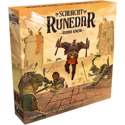 Seit Urzeiten haben die Minen von Runedar den Zwergen Reichtum beschert – doch die Zeiten des Wohlstands schienen vorbei. Bis jetzt! Denn eine kleine Gruppe Zwerge hat tief im Gestein eine neue Goldader entdeckt und sich bereits einen Schatz gesichert. Doch gerade als sie sich in Sicherheit bringen wollen, stellen sie fest: Die alte Festung von Runedar ist von Orcs umzingelt! In Die Schlacht von Runedar, einem kooperativen Brettspiel für 1-4 Spieler, müssen sie nicht nur die Festung verteidigen, sondern gleichzeitig einen Tunnel graben, um das Gold zu retten.