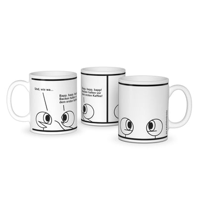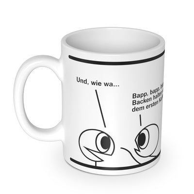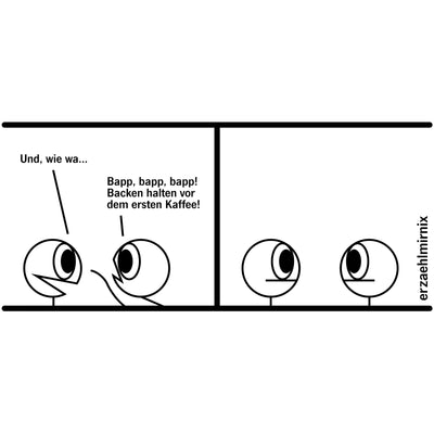 Was ist die erste Regel des Bürolebens? Nicht anfangen, zu reden, bevor Dein Gegenüber mindestens einen Kaffee intus hat. Was ist die zweite Regel des Bürolebens? Nicht anfangen, zu reden, bevor Dein Gegenüber mindestens einen Kaffee intus hat. Du merkst: So schwierig ist die ganze Chose nicht. Trotzdem sind wir öfters gezwungen, genau das zu tun, was auf dem erzaehlmirnix-Becher „Bapp Bapp Bapp“ zu sehen ist: Einfach laut Bapp Bapp Bapp rufen und die gesamte Umgebung daran erinnern, dass es die anfangs erwähnten Regeln gibt, die unbedingt befolgt werden müssen! ;)