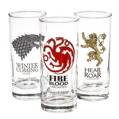 Von allen Charakteren (die alle eine recht geringe Halbwertszeit haben) ist Fans vor allem Tyrion Lannister ans Herz gewachsen. In Zusammenarbeit mit dem Liebhaber von Wein, Weib und Gesang präsentieren wir stolz das Gläserset zu Game of Thrones. Auf den drei bedruckten Trinkgläsern kannst Du die Wappen und Leitsprüche der Häuser Stark, Lannister und Targaryen bewundern und Dich fühlen, als ob Du an einem Gelage in King's Landing teilnimmst. Die anderen Häuser müssen leider draußen bleiben, wir haben aber schon Victarion Grejoy zur Glasbläserei geschickt, um die Handwerker zu "überzeugen". ;)