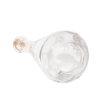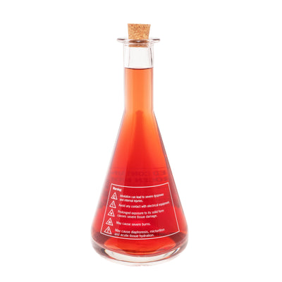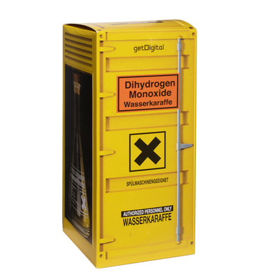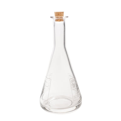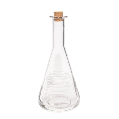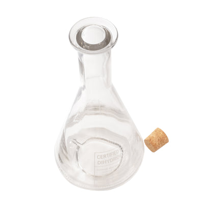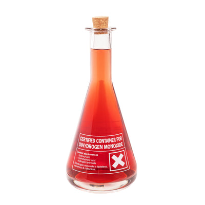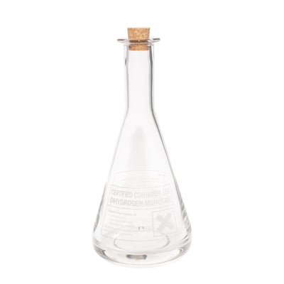 La jarra de agua DHMO de vidrio parece que la hubieras sacado de un laboratorio químico. Su forma se asemeja a un matraz Erlenmeyer, mientras que en el exterior tiene impresas varias advertencias (¡científicamente correctas!). Y para que tu DHMO no se contamine, esta jarra viene con un corcho para cerrarla.