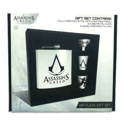 Dans ce set, tu trouveras (si tu es devenu membre de la Confrérie des Assassins) un homme plat en métal, deux gobelets et un entonnoir à remplir. Le logo de la série de jeux figure sur la flasque, les gobelets représentent un assassin en train de sauter et le blason de la confrérie. L'ensemble est livré dans une boîte décorative, ce qui en fait un cadeau parfait pour tous ceux qui s'intéressent aux assassinats, à l'histoire et aux lames cachées.
