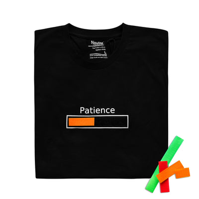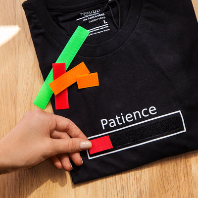 Sur le devant du t-shirt, tu trouveras une bande Velcro blanche avec le titre "Patience". Sur cette bande, tu peux appliquer l'une des bandes incluses en rouge, orange ou vert pour montrer à ton entourage à quel point tu es encore patient. Tu peux facilement couper les bandes colorées avec des ciseaux pour créer des barres de progression individuelles pour l'affichage. A partir de maintenant, tout le monde devrait savoir quand on peut s'amuser avec toi et quand on ne peut pas. ;)