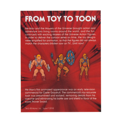 "Je suis Adam, prince d'Eternia et défenseur des secrets du château de Grayskull ! [...] De merveilleux pouvoirs secrets se sont révélés à moi lorsqu'un jour j'ai tendu mon épée magique et dit : Par le pouvoir de Grayskull ! J'AI LE POUVOIR !"