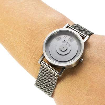 Sur le cadran, il y a trois cercles discrets sur lesquels les points des secondes, des minutes et des heures tournent comme des petits satellites. Le point des secondes fait un tour en 60 secondes, le point des minutes revient à son point de départ en une heure et le point des heures prend une demi-journée pour faire le tour de l'orbite. Les minutes et les heures sont également accompagnées de chiffres pour faciliter l'orientation et la lecture, mais seuls ceux qui sont encore d'actualité sont affichés, les autres restent cachés.