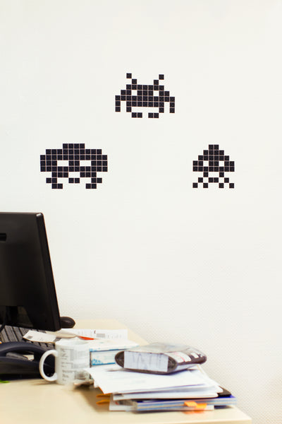 Depuis 1979, c'est l'étoffe dont sont faits les rêves de pixels. Tu as enfin la possibilité d'amener ce combat épique entre humains et aliens chez toi - en grandeur nature. Tu n'as besoin que d'un crayon, d'une règle et des stickers muraux Stickaz Space Invaders.
