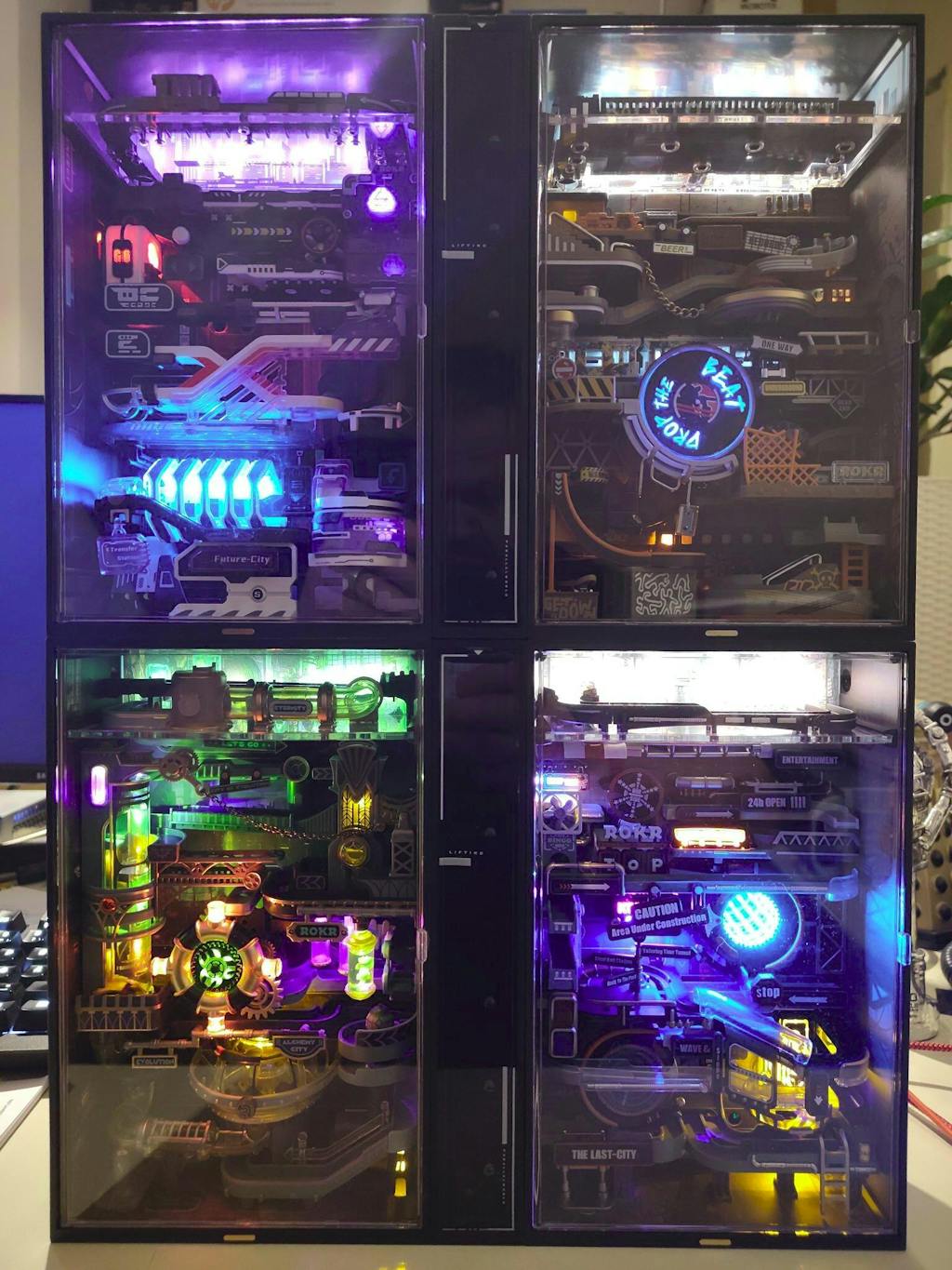 Photo zeigt eine aus vier Modulen bestehende Cyberpunk Murmelbahn von getdigital.de. In der Mitte der Module ist ein Aufzug der die kleinen Eisenkugeln nach oben befördert. Diese fallen dann abwechselnd links und rechts in ein Modul. Dort durchlaufen sie verschiedene Bahnen, die mit tollen Kleinigkeiten präpariert sind. Div. LED Beleuchtungselemente beleuchten und blinken dabei. Ist ein Modul durchlaufen fällt die Murmel in das darunter stehende Modul und durchläuft dann wieder eine Murmelbahn. Zum Schluss werden die Murmeln zum mittigen Aufzug geleitet, von dem sie wieder zwei Stockwerke hochtransportiert werden.