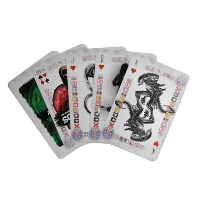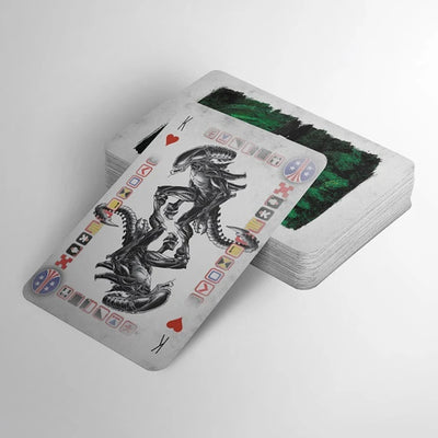 Per l'occasione, c'è il gioco Carte da gioco alieneche portano l'orrore fantascientifico della serie Alien nel tuo gioco. Il mazzo contiene una classica mano di poker con 52 carte da gioco e 3 jolly. Tutte le carte presentano motivi alieni come lo Xenomorfo, la silhouette di Ripley o il Chestburster.