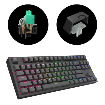 Das wichtigste Feature einer mechanischen Tastatur sind natürlich die Schalter. Hier punktet die KD87A mit den einzigartigen Schaltern der neuesten Generation Gateron Cap Teal. Diese wurden bei der Montage vollständig gewachst, um eine optimale Leistung und Haltbarkeit zu gewährleisten. Mit einer Reaktionszeit von nur 1 ms reagiert die Tastatur blitzschnell auf jeden Tastendruck.