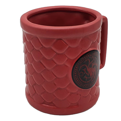 Con il tazze 3D di Game of Thrones la potente Casa Targaryen è virtualmente "a portata di mano": La tazza della Casa Targaryen è naturalmente rossa, mostra lo stemma della Casa con il drago intrecciato ed è modellata sulle scaglie di un drago.