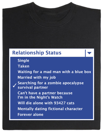 Wir haben uns angewöhnt, unser Umfeld genauso wie Fremde in Echtzeit über alle Details unseres Lebens zu informieren - natürlich auch über den aktuellen Beziehungsstatus. Dummerweise ist die Holografie noch nicht so weit, dass auch im Reallife immer der Status neben unserem Kopf erscheint. Wir lösen dieses Problem mit, natürlich, einem Shirt. ;)