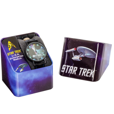 Aber bei den Star-Trek-Armbanduhren handelt es sich nicht nur um schnöde Zeitmesser, sondern um eine geballte Ladung Science Fiction mit echten Raumschiffen! Bei der Enterprise-Armbanduhr dreht nämlich die USS Enterprise neben Stunden- und Minutenzeiger ihre Runden über dem Ziffernblatt!