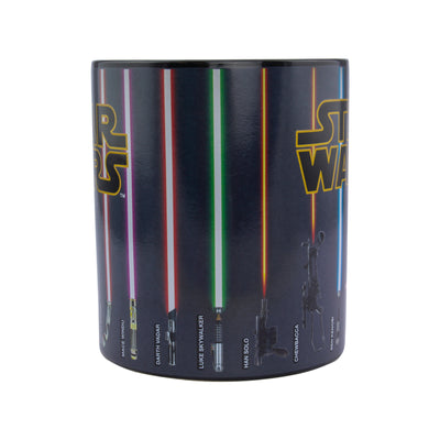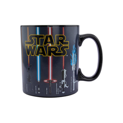 Der Becher fasst bis zu 450 ml und bietet allen berühmten Lichtschwertern und weiteren Waffen aus dem Star Wars-Universum Platz. Im kühlen Zustand bleibt der Becher dunkel und die Waffen gesichert, aber wenn du eine heiße Flüssigkeit hineinfüllst, leuchten die bunten Energiewaffen auf. Ob da nicht doch ein bisschen Macht im Spiel ist?