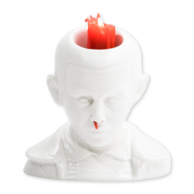 Mit dem Eleven-Kerzenhalter kannst Du Dir ein Abbild dieser jungen Heldin in die eigenen vier Wände holen. Wenn Du eine der beiden enthaltenen roten Kerzen anzündest, fließt das Wachs aus der Nase der Büste heraus - ganz wie bei ihrem Vorbild aus einer strangen TV-Serie! Damit die Nase nicht verstopft, liegt der Büste außerdem ein spezielles "Nasenbohr-Werkzeug" bei, mit dem Du eingetrocknetes Wachs entfernen kannst. Außerdem empfehlen wir Dir, die Büste nicht unbeaufsichtigt in der Nähe von Eierwaffeln stehen zu lassen. ;)