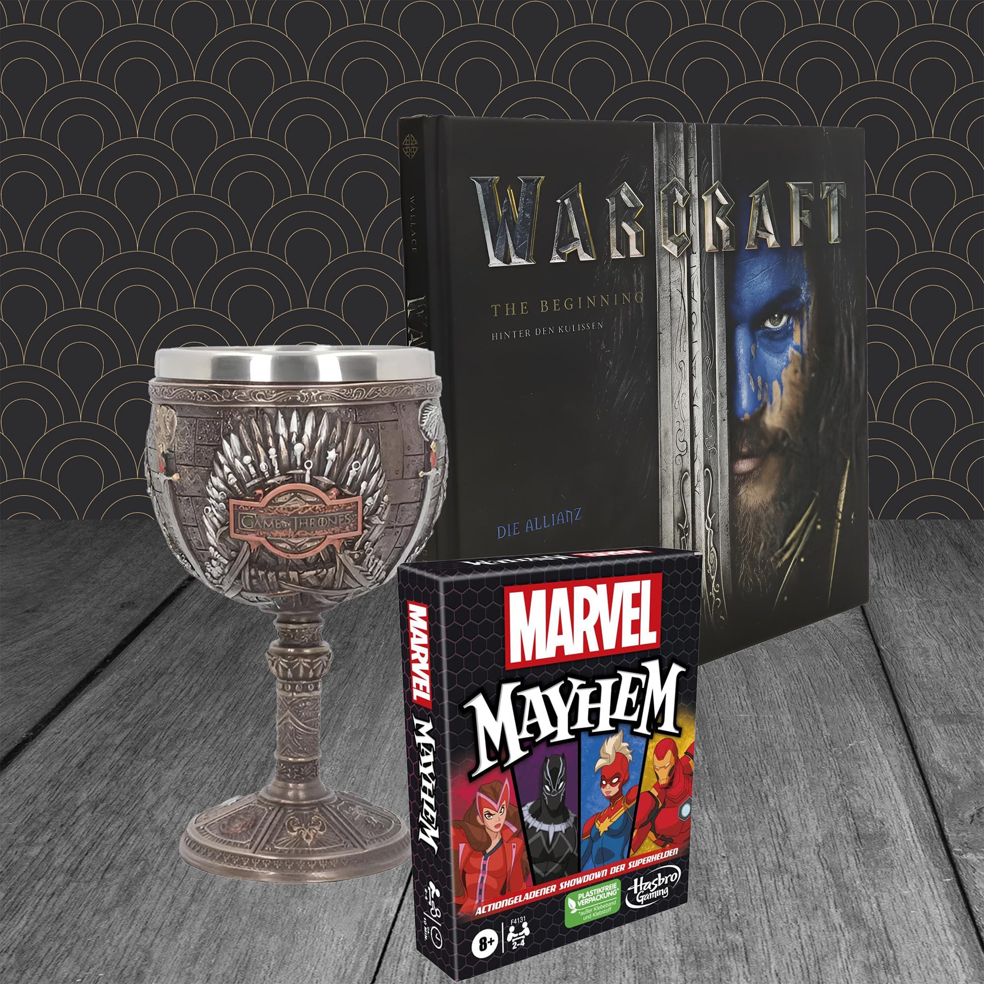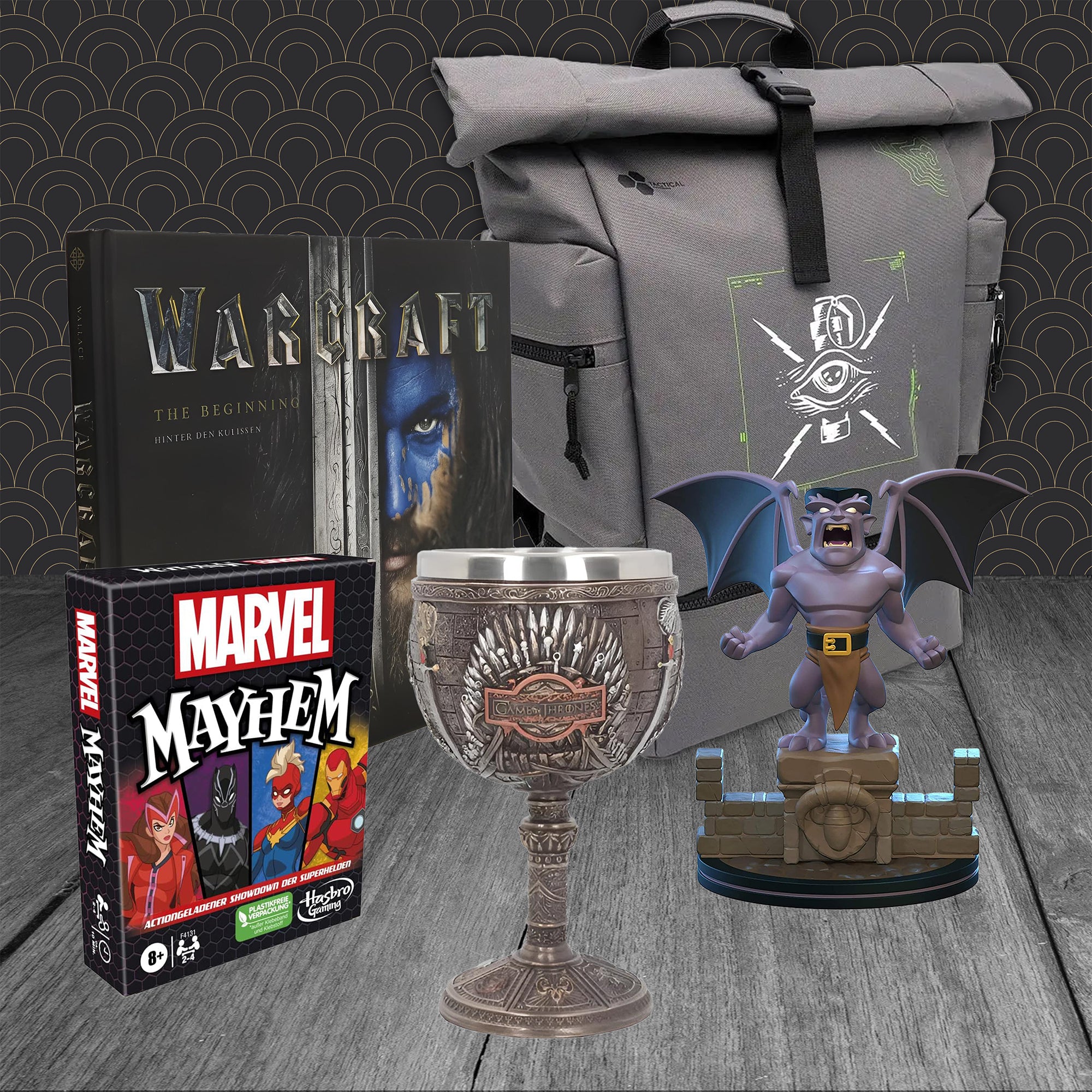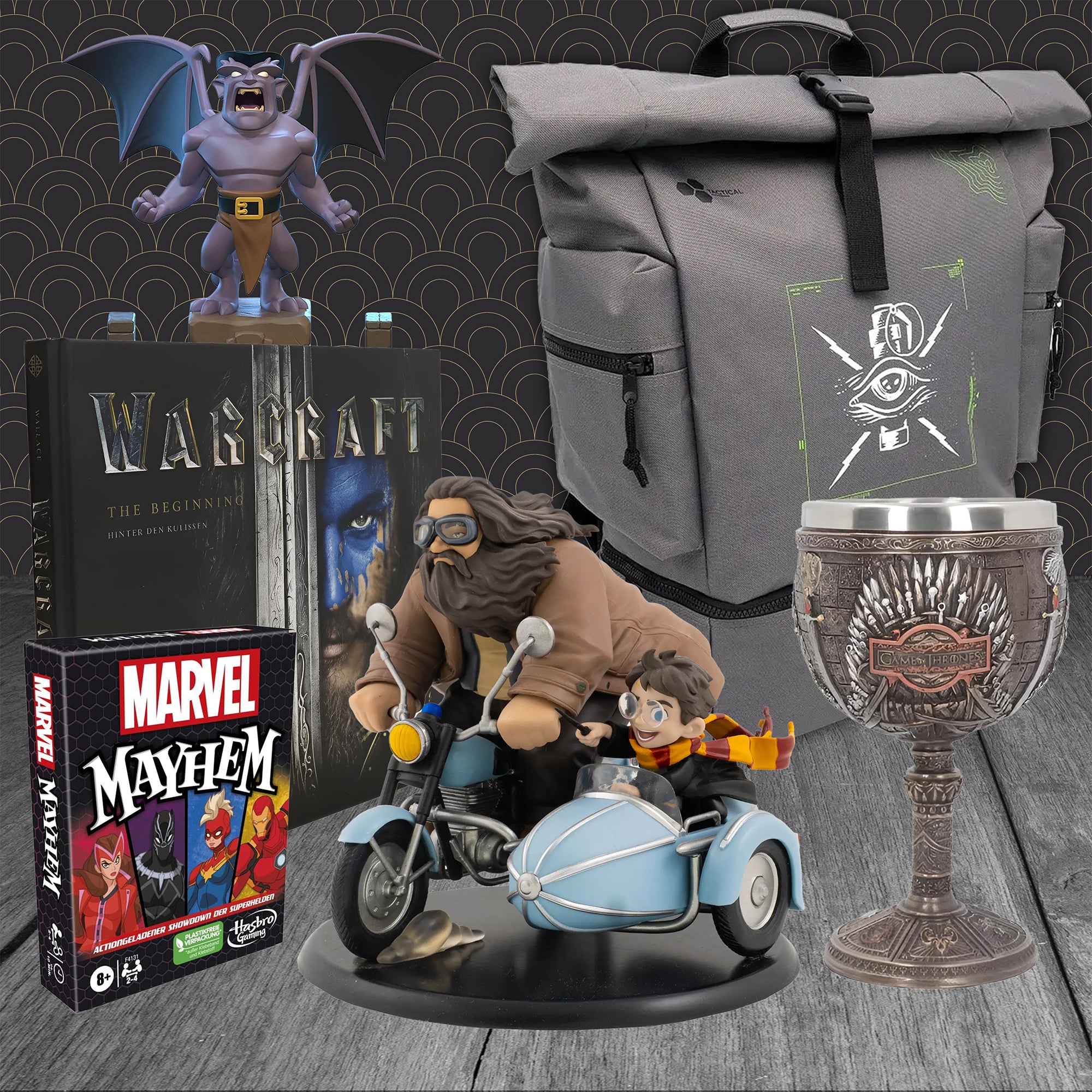 In allen drei Überraschungsboxen befinden sich Neuware-Artikel aus unserem gesamten Shop oder aus vergangenen Lootboxen. Das kann alles mögliche sein. Figuren, Gadgets, Haushaltsgegenstände, Merchandise, Kissen, Comics, alles. Welche Artikel das genau sind, wollen wir natürlich nicht verraten.